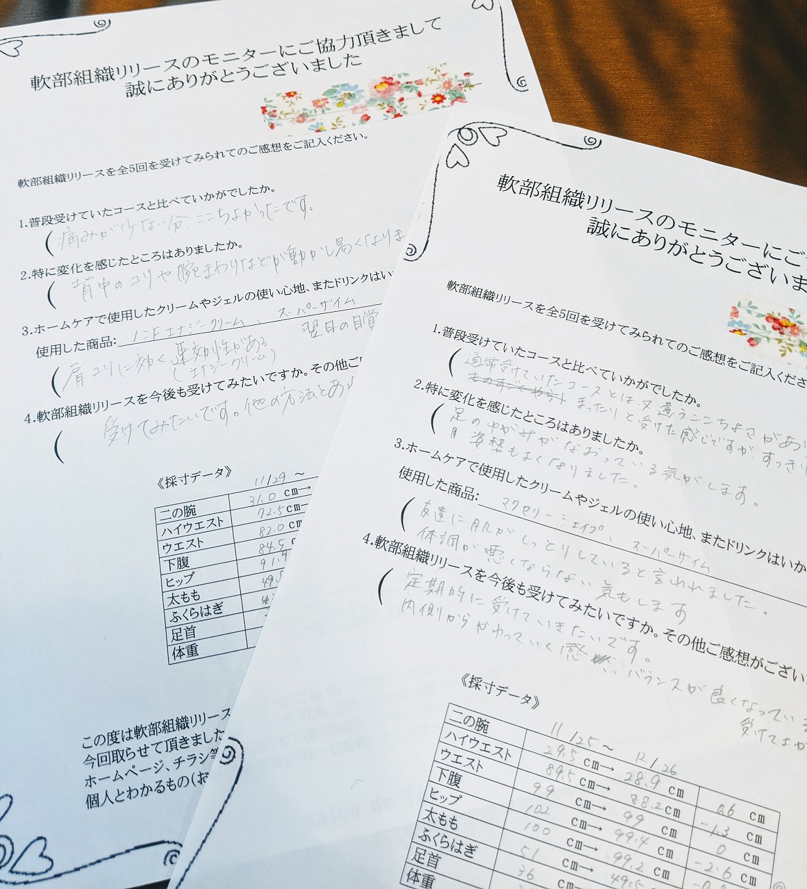 ・普段ボディメイキングコースを受けていましたが、この軟部組織リリースは痛みが少ない分、心地よかったです。