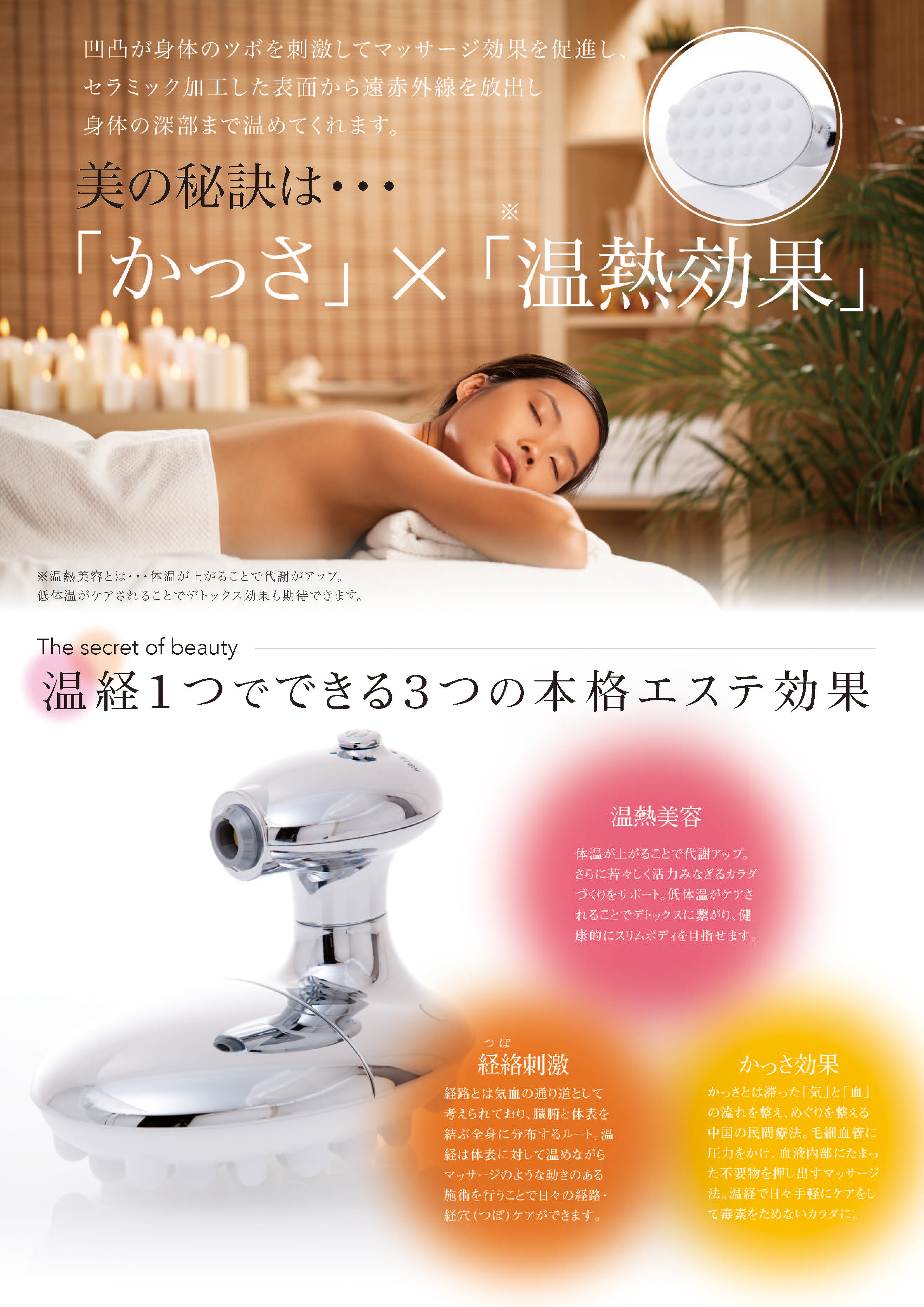 温めて、ほぐす。 温めて、ほぐす「温活経絡」がスタートしました!背中やふくらはぎなど、固くなりがちなことろを温めながらゴリゴリとほぐしていくんですが、これがとっても気持ちいいんです!10分からお好きな時間かけることができます。60分以上のボディコースをご利用の際に追加できます。サイズダウンしたい方にもおすすめです。 通常10分3000円→初回10分 2700円(税込)